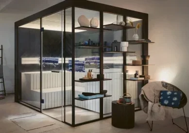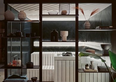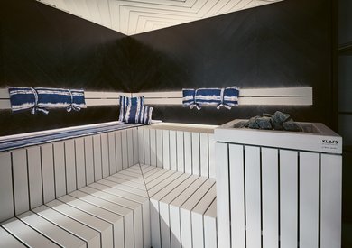 Nezgrešljiv značaj savne GESA se odraža v njenih jasnih linijah. Osrednji element tega posebej domačega oblikovalskega koncepta so temno črne stenske plošče, ki so oblikovane po vzoru lesa Yakisugi iz Japonske. Bel strop, bele lesene površine ležalnikov in obloge peči za savno tvorijo jasen kontrast črnemu videzu.